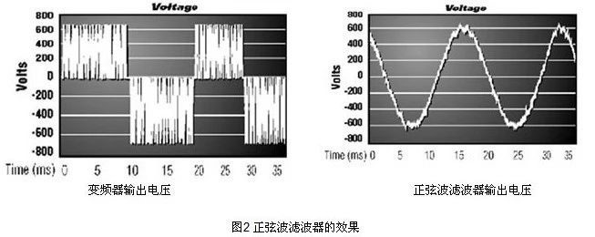 解決電機(jī)過(guò)熱的方法是減小電機(jī)驅(qū)動(dòng)電壓中的高頻成份。實(shí)現(xiàn)這個(gè)目的方法是在變頻器的輸出端安裝SWF正弦波濾波器。正弦波濾波器將PWM電壓波形變換成適應(yīng)于電機(jī)的正弦波電壓波形,如圖2所示,從而消除了電機(jī)過(guò)熱的現(xiàn)象。