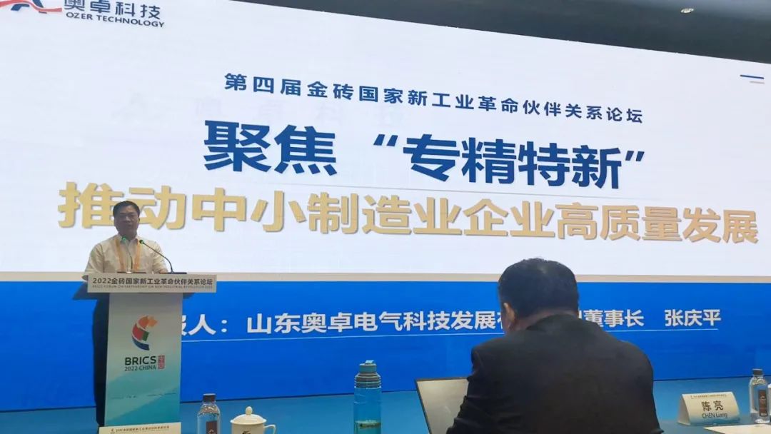 2022年9月7日,“2022金磚國家新工業(yè)革命伙伴關(guān)系論壇”在廈門舉行,山東奧卓電氣科技發(fā)展有限公司作為山東省“專精特新”制造業(yè)企業(yè)代表受邀參加,公司董事長張慶平出席論壇,并以 “聚焦專精特新,推動中小制造業(yè)企業(yè)高質(zhì)量發(fā)展”為題就公司在轉(zhuǎn)型升級過程中對“專精特新”發(fā)展模式的探索與實踐做了報告。